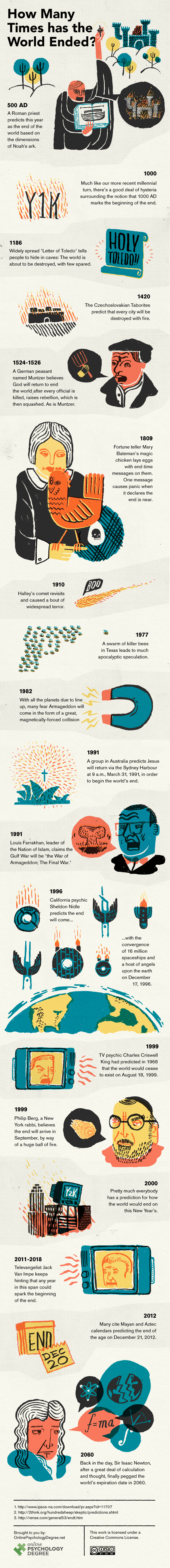I was contacted a couple of weeks ago by a woman named Allison Morris.  She had come across my post, End of the World Stories We Love to Hate, and sent me a graphic she helped create on a timeline of failed apocalypse predictions (well, one still remains to be seen).