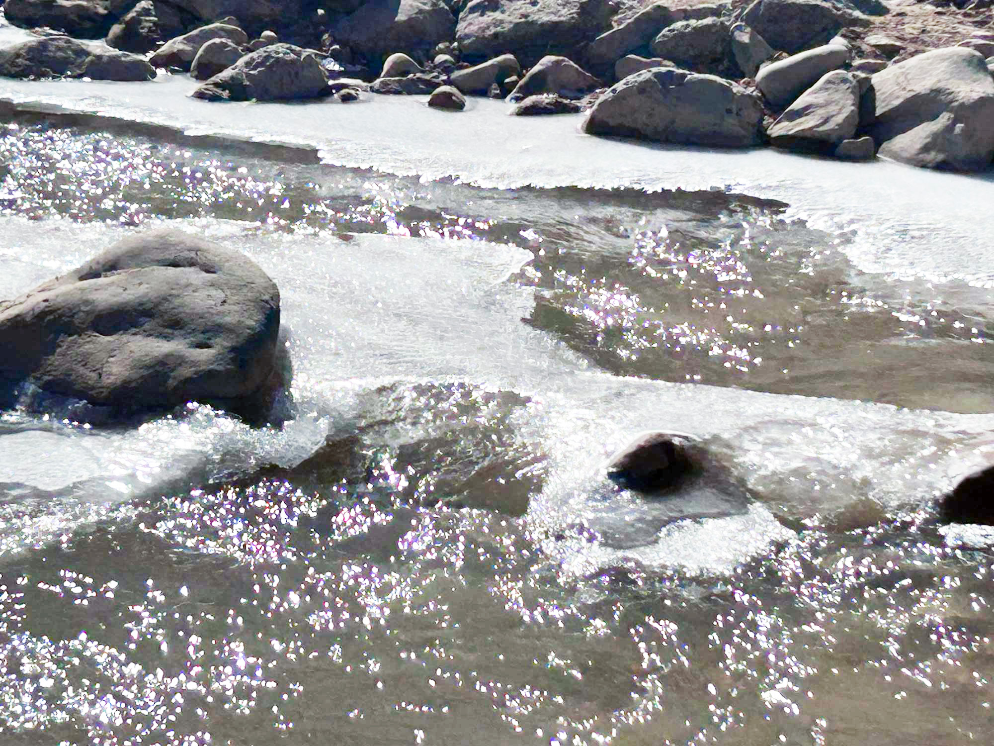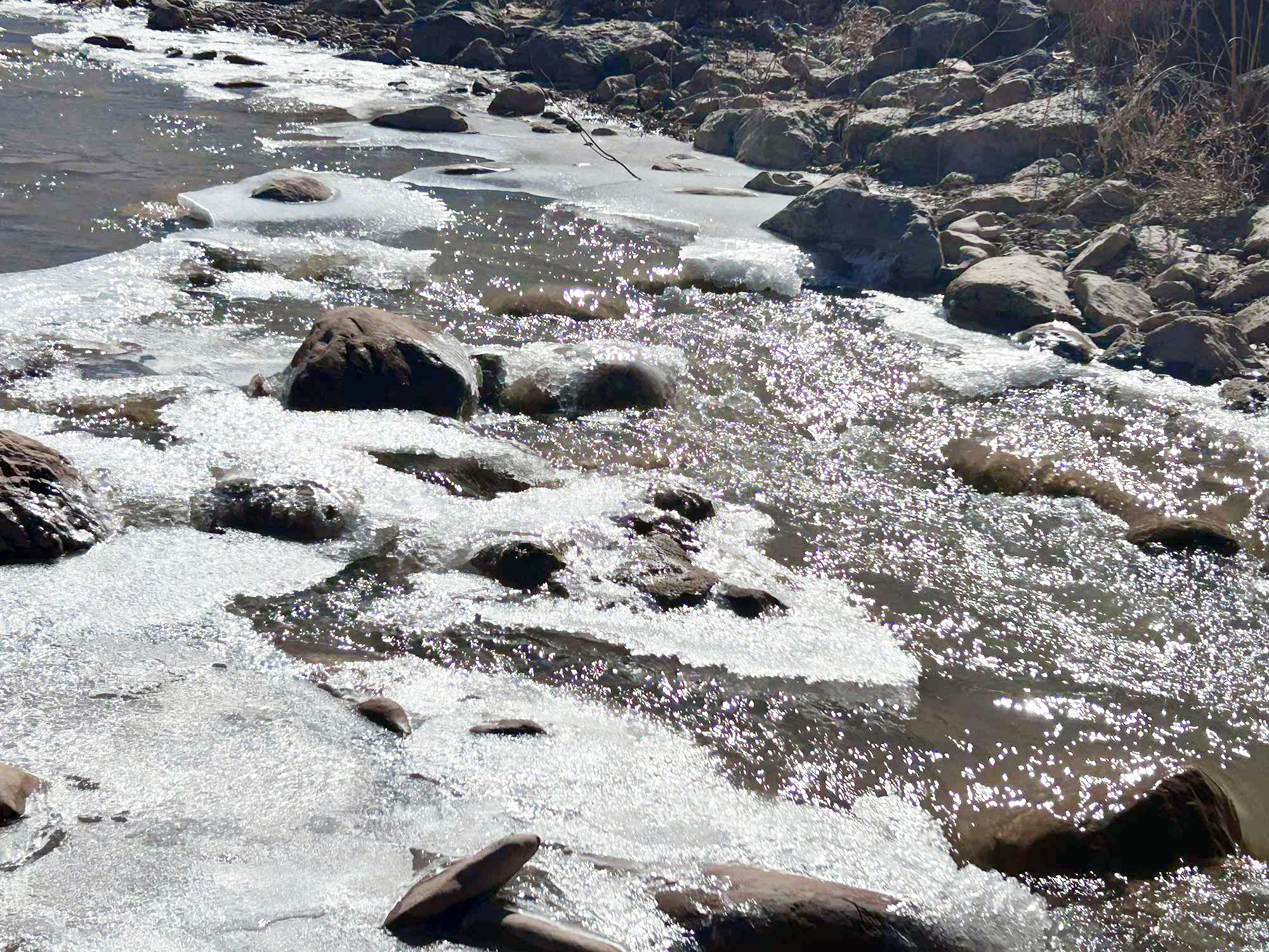 As the slower moving areas of water along the creek edges, behind rocks, and in the shallows begin to succumb to frazil ice, the faster moving water continues to move around the frozen parts – more rapidly even, it seems. Almost like it’s fighting the process.