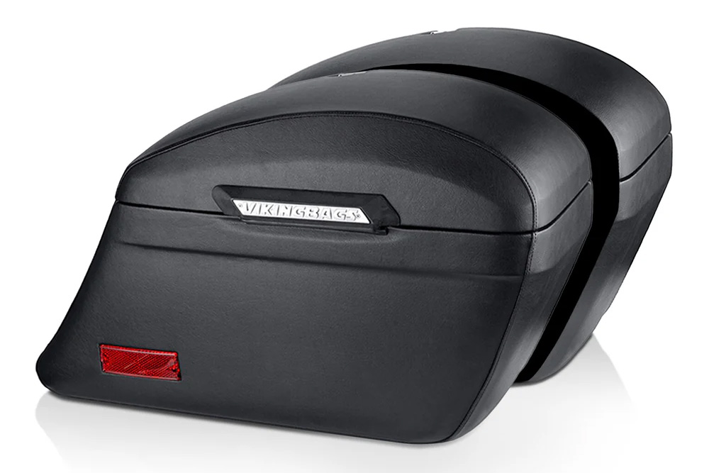 The best I could find on the H-D website for my 2004 was a set of bags offering a little over 22 liters of total storage (compared to the approximate 34 liters of my stock bags). After trying a couple different sets of bags, I went looking for something that has the capacity (and quality) my cruiser calls for, and I found Viking’s 44L Lamellar Stallion Extra Large Leather Covered Motorcycle Hard Saddlebags.